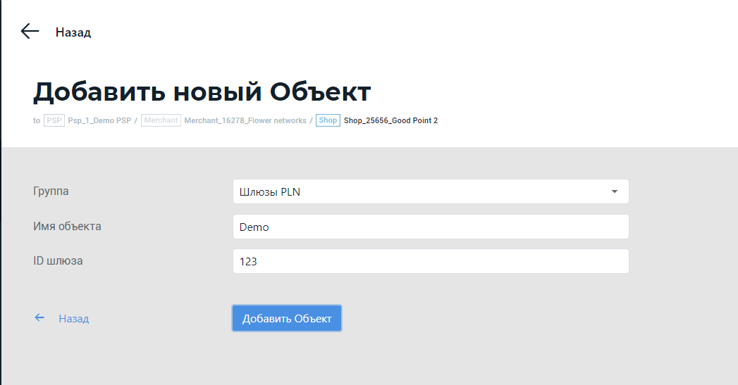Уникальный идентификатор объекта. Необходимо указать идентификатор платежного шлюза или банка-эквайера в системе поставщика платежных услуг. Обратитесь в Службу технической поддержки при необходимости. |