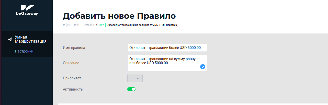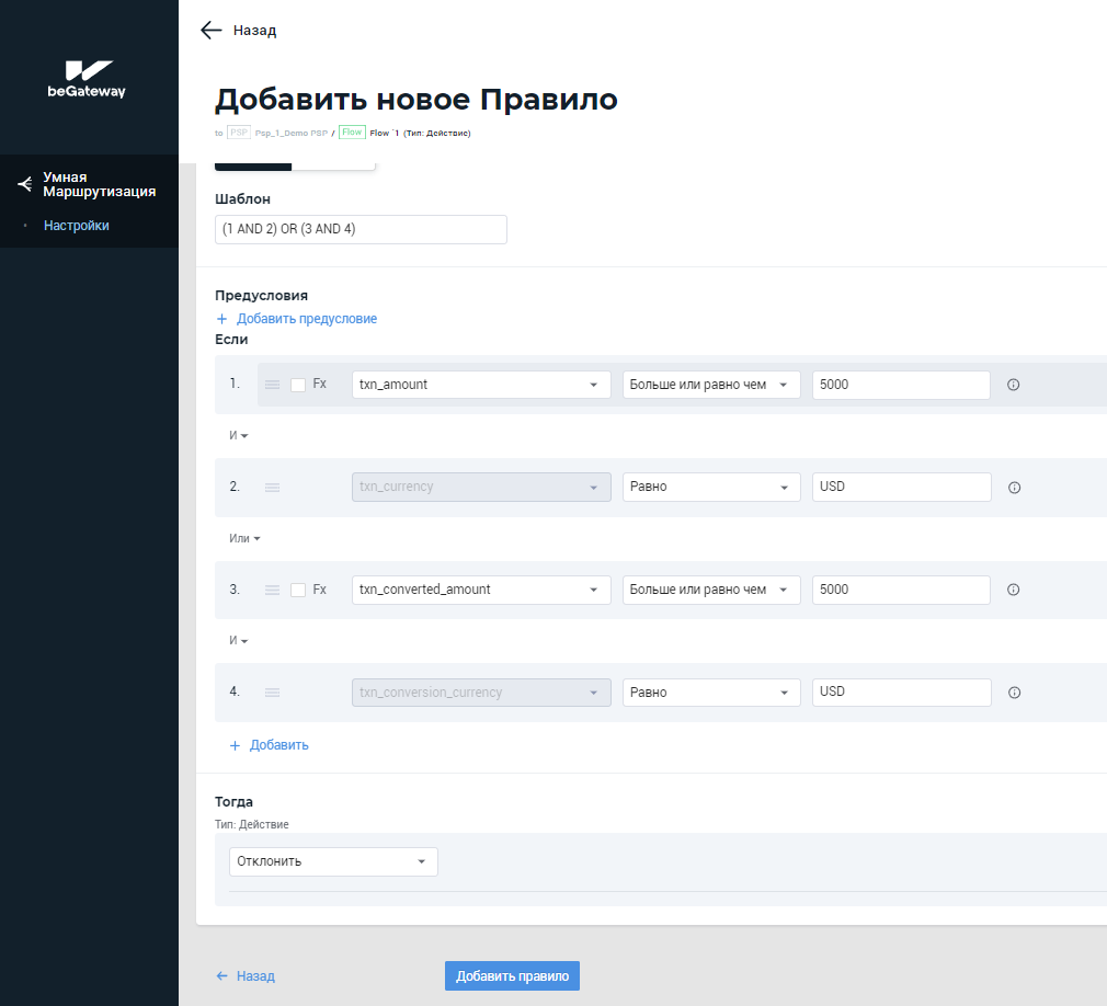 Пример 1: Создание правила для отклонения всех транзакций на сумму более USD 5000.00