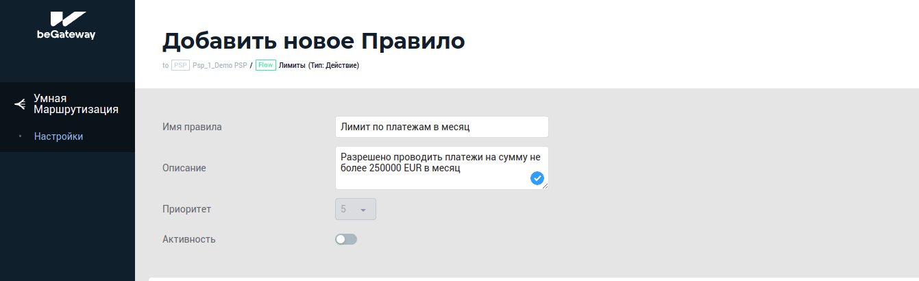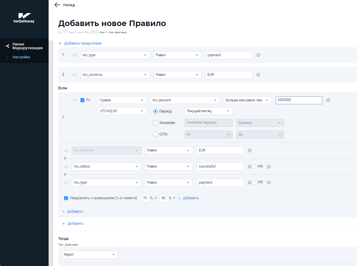 Пример 2: Создание правила на отклонение транзакции типа Payment, если сумма всех таких транзакций за месяц превышает EUR 2500000 с отправкой уведомлений о приближении к лимитам