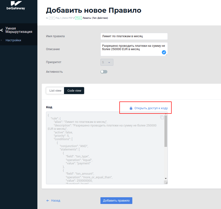 Кнопка “Открыть доступ к коду” при создании правила в режиме кода