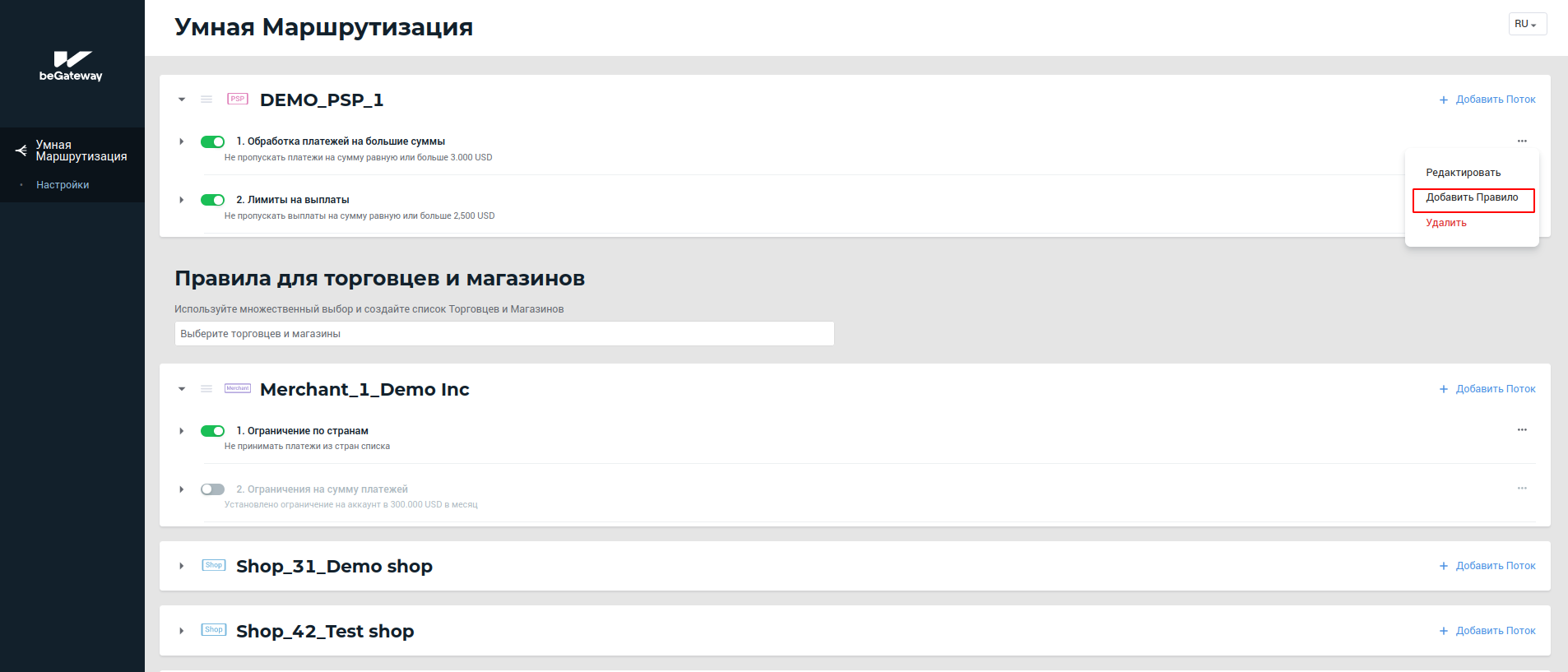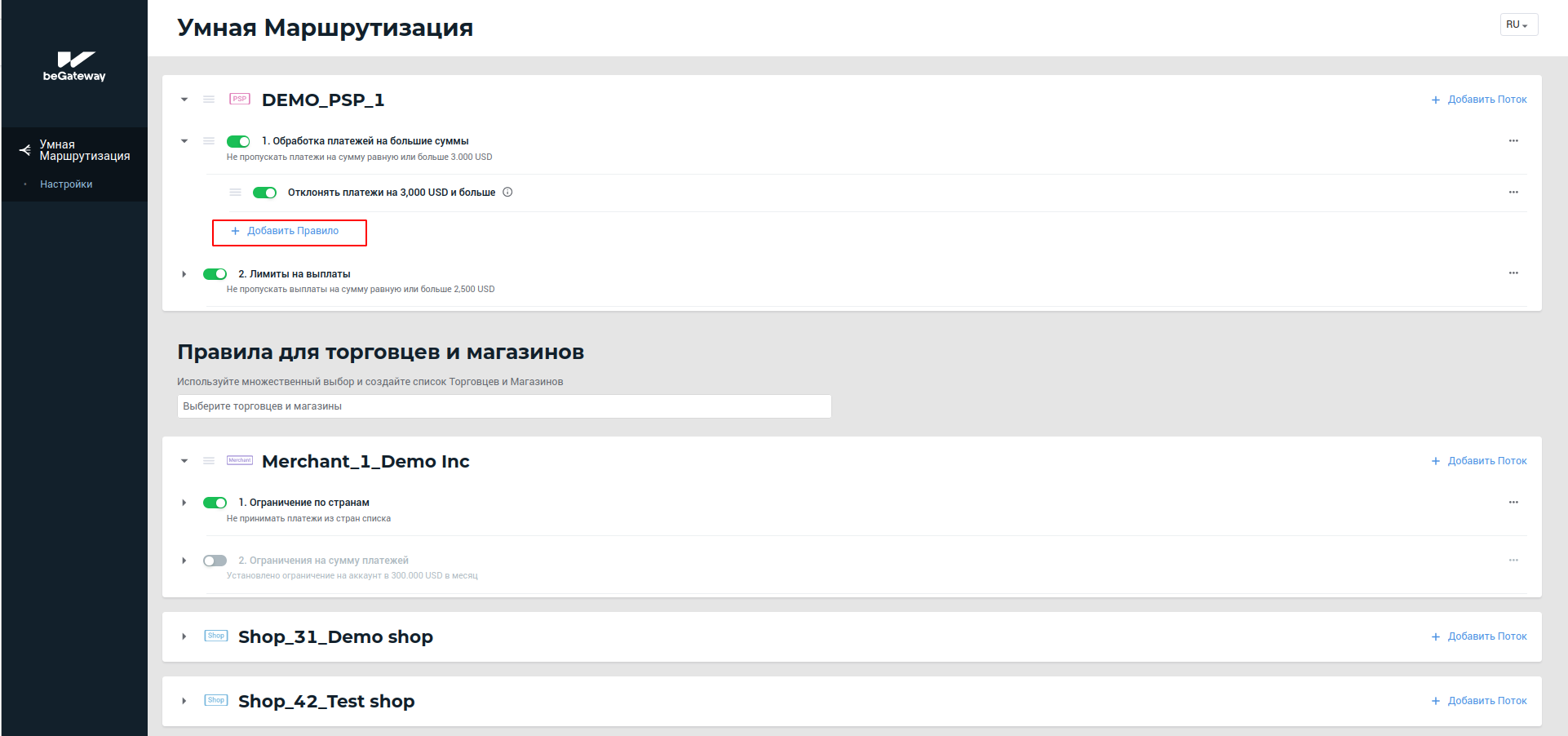 Кнопка “+Добавить Правило” под списком правил потока