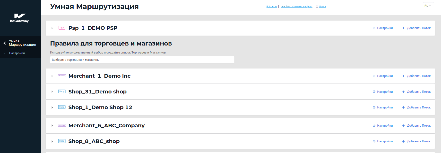 В настоящее время сервис Умная Маршрутизация доступен только авторизованным пользователям системы beGateway с ролью Администрирование. При отсутствии прав доступа обратитесь к администратору системы.