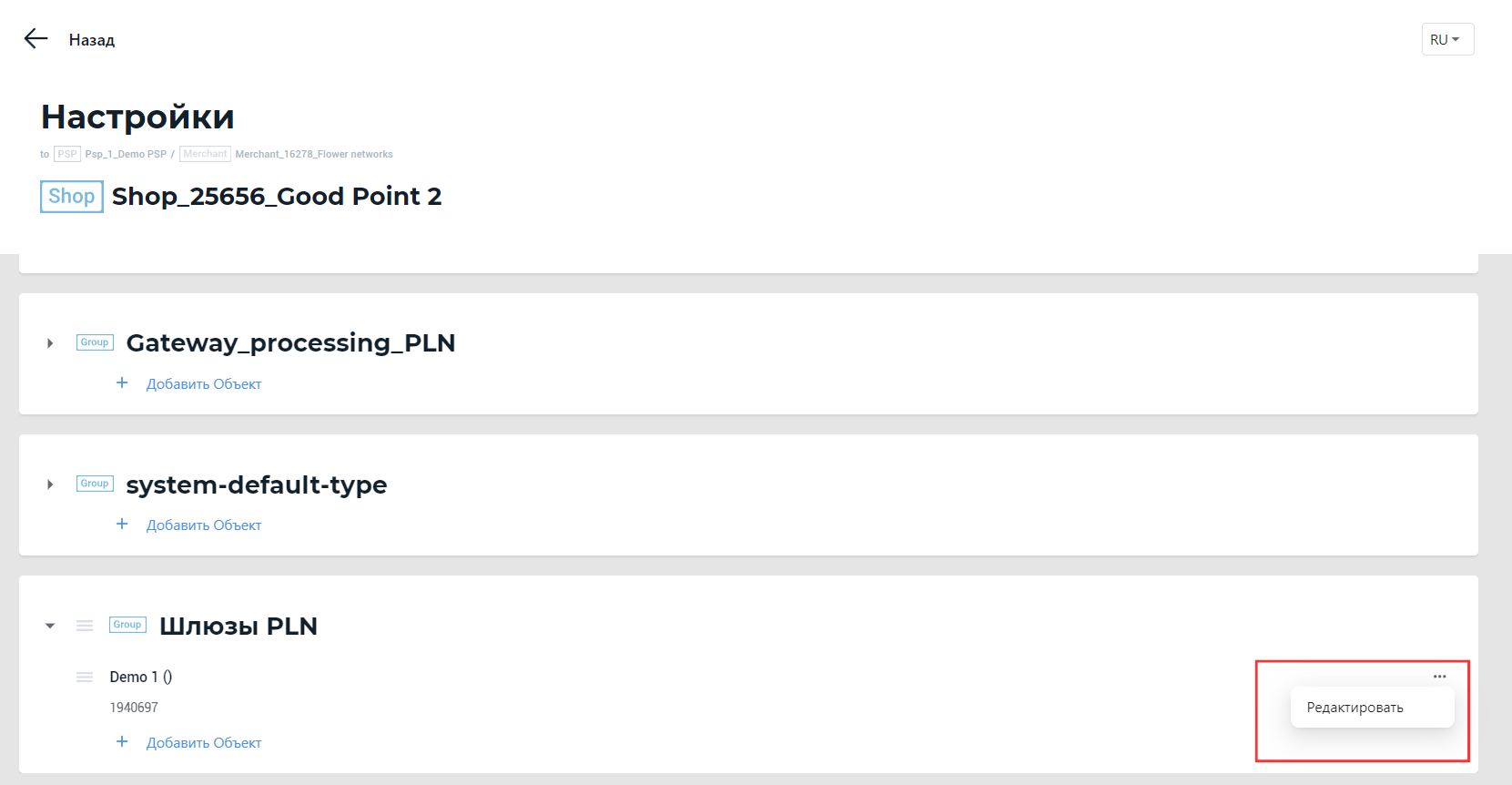Для редактирования объекта выполните следующие действия: