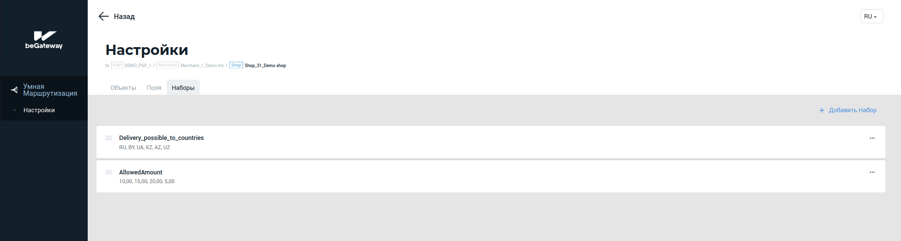 Просмотр наборов Для просмотра наборов на странице настроек учетной записи нажмите на вкладку Наборы. Сервис отобразит ранее добавленные наборы и массив их значений. Если в предыдущих версиях Умной Маршрутизации вы создавали диапазоны, сейчас они будут отображены во вкладке Наборы. Список наборов учетной записи