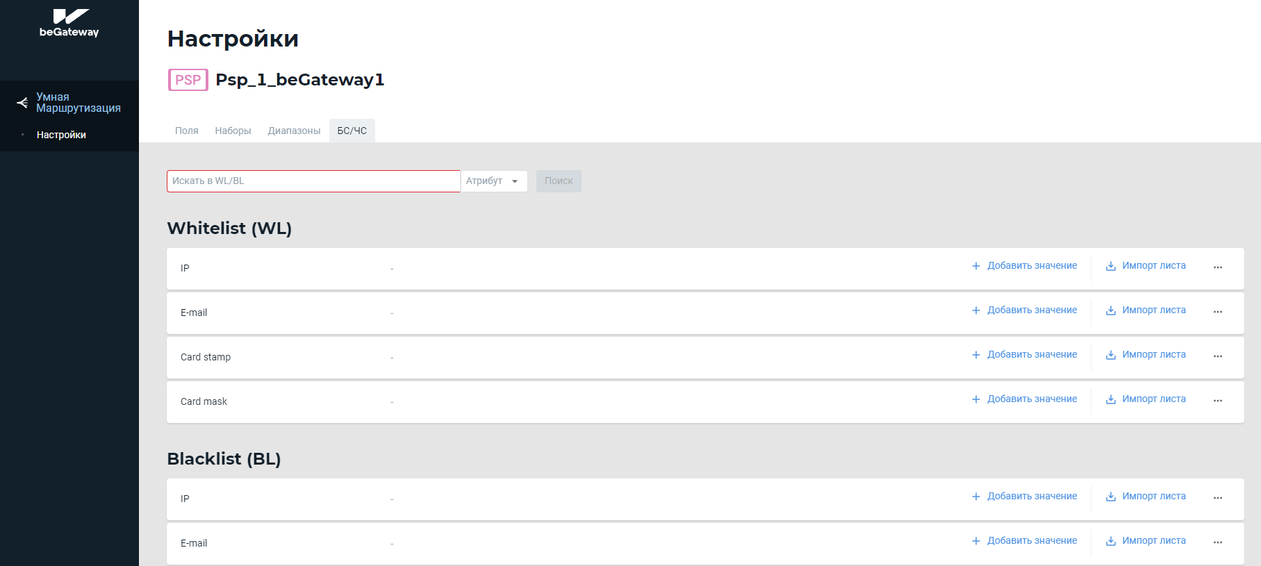 Просмотр белых/черных списков Для просмотра применяемых белых и черных списков перейдите на вкладку БС/ВС. Для навигации можно использовать строку поиска: выберите тип атрибута из выпадающего списка и введите точное искомое значение атрибута.