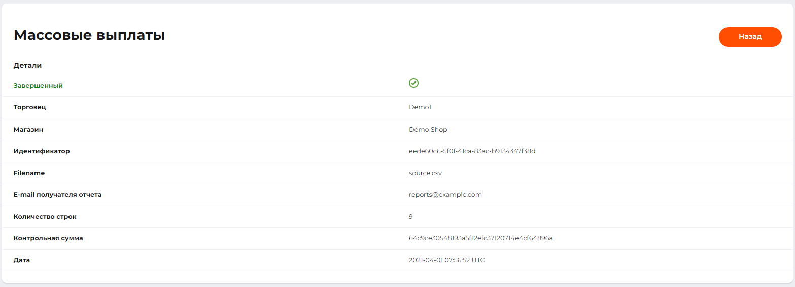 На открывшейся странице можно увидеть детальную информацию о массовых выплатах с параметрами, описанным в таблице ниже.